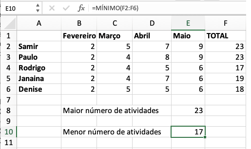 - =MÍNIMO(F2:F6), para trazer o menor valor.