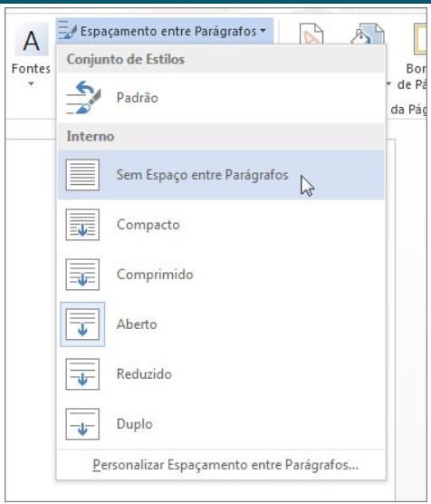Se você não gosta das opções, clique em Espaçamento de Parágrafo Personalizado e mude os números em Espaçamento entre Parágrafos.