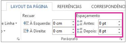 Vá para layout e, em espaçamento, clique nas setas para cima ou para baixo para ajustar a distância antes ou depois do parágrafo. Você também pode digitar um número diretamente.