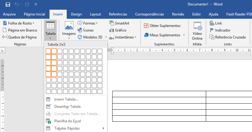 2. Na aba "Inserir", clique na opção tabela e selecione a opção 2x5, como mostra a imagem abaixo;