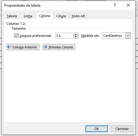 6. Na aba "Coluna", defina o tamanho para "3.5 cm";