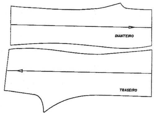 Observe como as costas dos tamanhos 2 e 4 foram riscadas pela metade, exatamente na dobra do tecido. Desdobrando o tecido, depois de cortado, a peça riscada pela metade aparecera inteira.