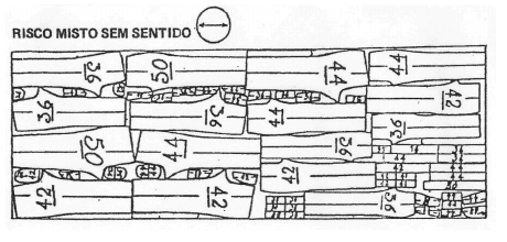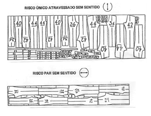 Risco é o mesmo que traço. Significa contornar os moldes distribuídos no encaixe. Riscos normais: são aqueles feitos com a colocação dos modelos no sentido do urdume do tecido, ou seja, do comprimento, paralelo a ourela. Riscos atravessados: os moldes são colocados no encaixe, de modo que fiquem na posição da trama do tecido, ou seja, de sua largura.