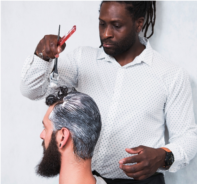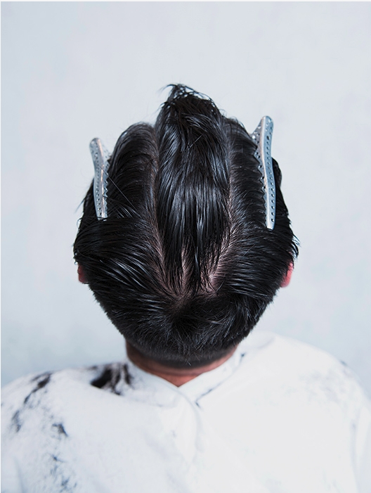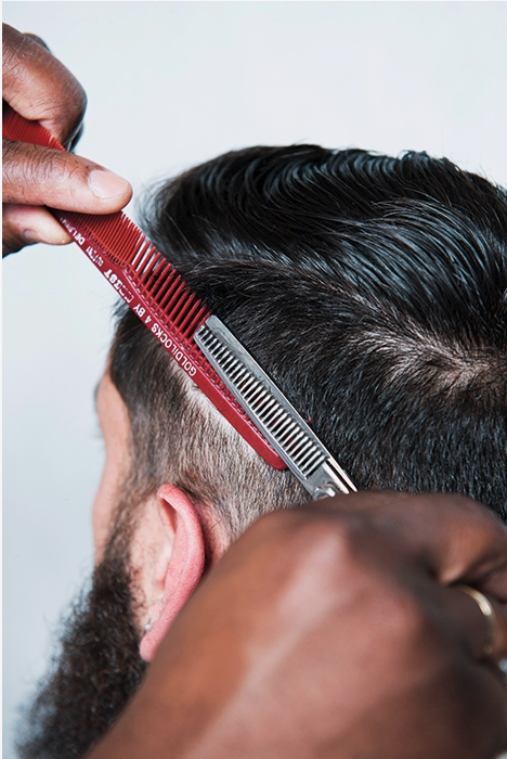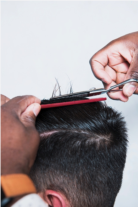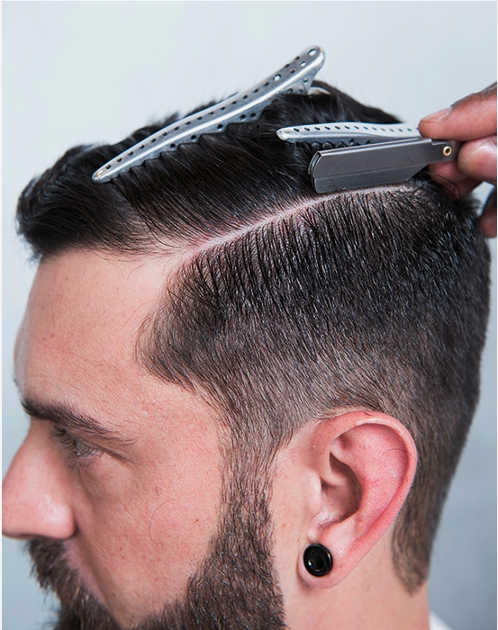 16 – Com auxílio de uma navalha, faça a divisão do corte, deixando nítido o caimento dos fios, facilitando seu pentear. Faça uma escova e modele o topete com pomada.