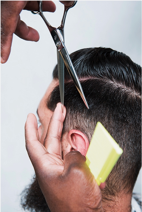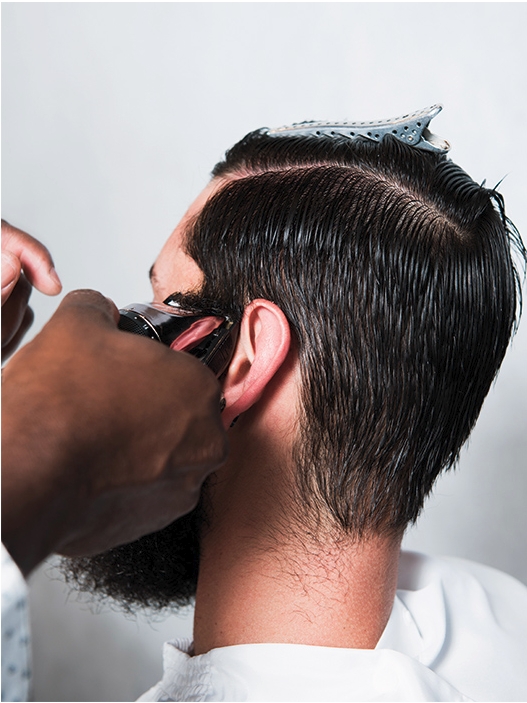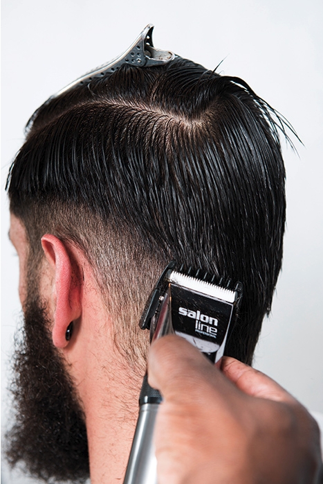 4 – Continue a passar a máquina e, quando chegar 1 cm atrás da orelha, incline o aparelho, criando uma meia-lua. Repita o procedimento no outro lado.