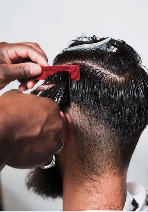 3 – Após remover o relaxante, penteie os fios e comece a técnica do fade com a máquina. Inicie com a máquina 1 na lateral, reto, até um dedo atrás da orelha.