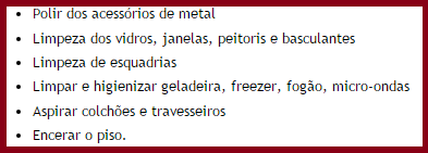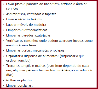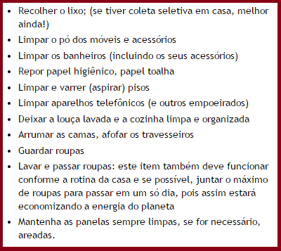 Segue aqui uma pequena lista, despretensiosa, para que haja uma organização dos afazeres da casa. Seja para fazer ou para orientar, é importante que você saiba tudo o que acontece em sua casa.