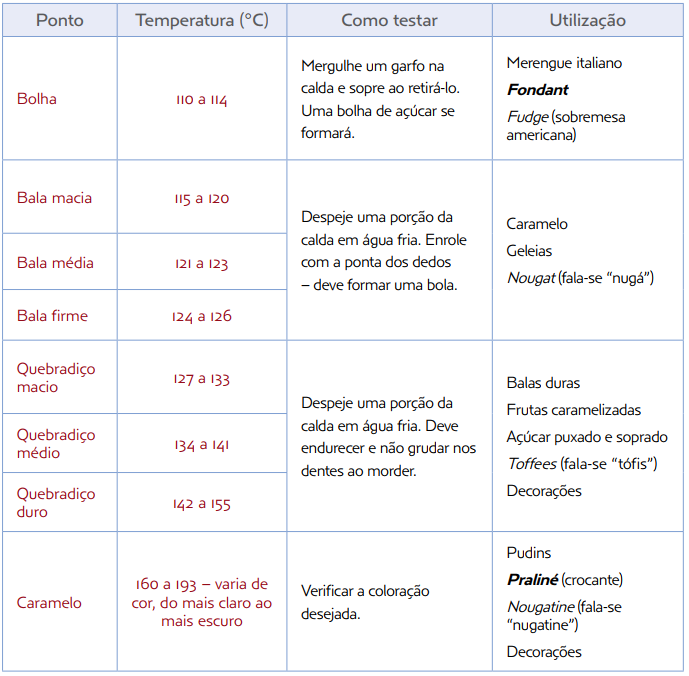 O açúcar se transforma quando submetido ao calor. A tabela a seguir indica a obtenção de diferentes “pontos” do açúcar, conforme a temperatura a que é exposto.