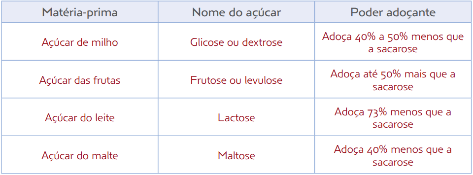 O açúcar utilizado cotidianamente, conhecido como “açúcar de mesa”, é a sacarose. O açúcar pode ser produzido a partir de diversas matérias-primas, como mostra a tabela a seguir:
