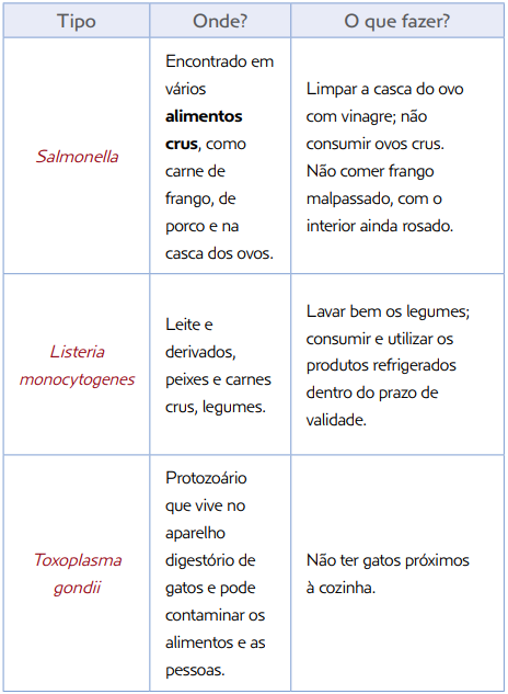A maioria das doenças transmitidas por alimentos é causada por um tipo de microrganismo chamado bactéria. Existem ainda outros tipos de microrganismos: fungos, vírus e protozoários. Os microrganismos multiplicam-se nos alimentos quando encontram nutrientes e condições ideais de umidade e temperatura.