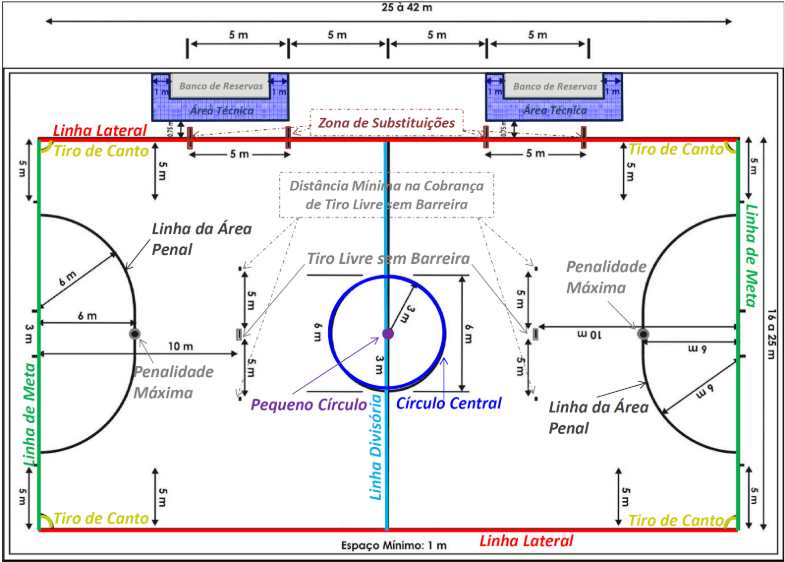 Tem de 25 a 42 metros de comprimento (linha lateral) por 15 a 25 de largura (linha de baliza). As marcações que o delimitam têm 5 cm de espessura.