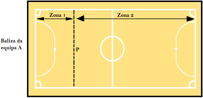 Se a falta foi cometida pela equipa A na zona 1, o executante da equipa adversária pode optar pela marcação do pontapé livre direto no local onde a falta foi cometida ou na segunda marca de grande penalidade (P). Se a falta foi cometida pela equipa A na zona 2, o pontapé livre direto será marcado com a bola colocada na segunda marca de grande penalidade. Em ambos os casos, não há barreira e o marcador do pontapé livre direto é obrigado a rematar diretamente à baliza, estando os restantes jogadores atrás da linha da bola e a, pelo menos, 5 metros de distância. O guarda-redes deve permanecer no interior da sua área de grande penalidade, a uma distância mínima de 5 metros da bola.