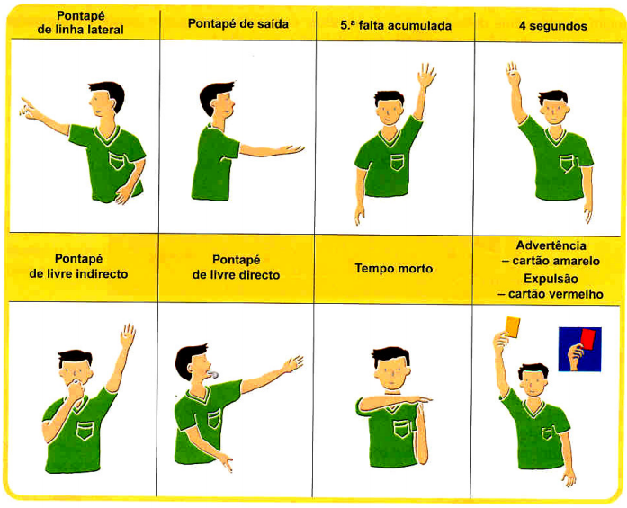Um jogador será expulso, através da exibição do cartão vermelho, se evidenciar conduta violenta, comportamento injurioso, voltar a cometer uma falta para a qual já tinha sido advertido ou efetuar uma falta sobre um adversário que se aproxima isolado da sua baliza, evitando assim uma situação clara de golo. O jogador expulso não participa mais no jogo, podendo ser substituído passados 2 minutos, ou antes, se entretanto, a sua equipa sofre um golo. Descontos de Tempo Cada equipa tem direito a solicitar um desconto de tempo de 1 minuto, em cada parte do jogo. A solicitação de tempo morto só poderá ser concedida quando a equipa estiver na posse da bola. Sinalética de Arbitragem