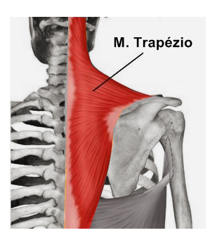 O mais importante deles é o chamado trapézio, denominação originada da sua forma. Dispõe-se como um capuz de monge e por esse motivo era conhecido antigamente como músculo cucullaris (do latim cucuilus, capa). É responsável pelo movimento conhecido popularmente como “dar de ombros”, em que o trapézio eleva a omoplata (ou escápula) e, com ela, todo o ombro. O músculo elevador da escápula também participa desse movimento.