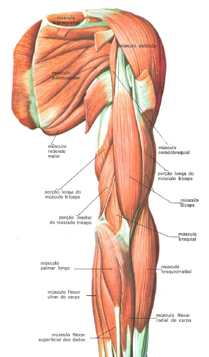 Os quatro principais músculos do braço – porção do membro superior que vai do ombro ao cotovelo – dispõem-se em dois grandes grupos: um anterior e um posterior.