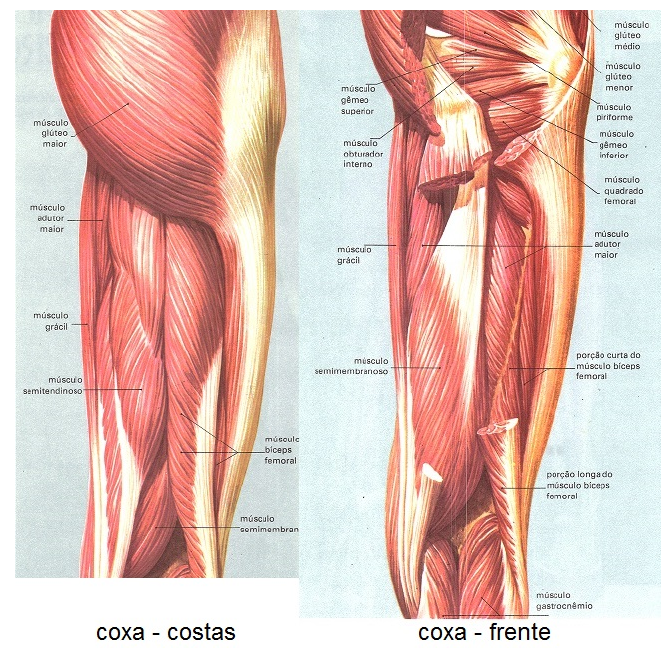 Na porção posterior da coxa, destacam-se três músculos: o semigendinoso, o semimembranoso e o bíceps crural.