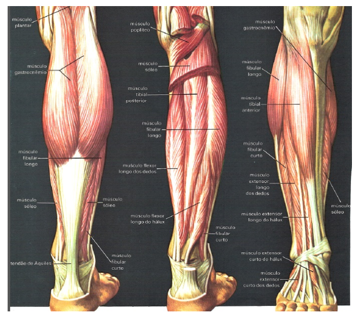 Sua contração flexiona o pé sobre a perna e estende os dedos do pé. Na porção posterior da perna, destacam-se os músculos gêmeos, que formam a chamada panturrilha (“barriga da perna”). Iniciam-se, separadamente, na cavidade poplítea, unindo-se depois e terminando no chamado tendão de Aquiles. Os músculos provocam a flexão da perna, na altura da articulação do joelho, e estendem o pé, de modo a possibilitar a elevação do corpo na ponta dos pés.