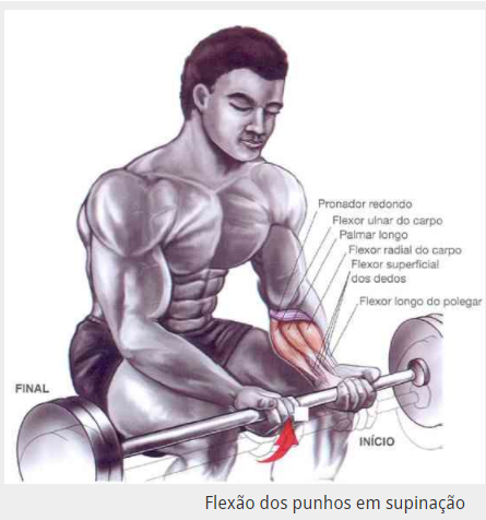 Este é o exercício mais utilizado para trabalhar os músculos flexores dos punhos. Utilize pesos razoáveis e evite o uso da “batota / impulsos”.