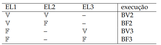 Nas estruturas de decisão encadeadas, uma estrutura de condição é aninhada dentro de outra, como bloco verdade ou falsidade. Neste modo, para que a estrutura de condição mais interna seja avaliada, é necessário que uma determinada condição seja satisfeita na estrutura de uma condição mais externa.Considere a estrutura aninhada no algoritmo 11, onde EL significa expressão lógica, BV bloco verdade e BF bloco falsidade. Para que BV2 seja executado é necessário que a EL1 juntamente com EL2 sejam verdadeiras. Se EL1 for verdadeira mas EL2 for falsa, então é BF2 quem será executado. A tabela 6.1, chamada tabela de decisão, mostra as diferentes alternativas possíveis para este caso.