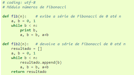 Um exemplo,usar seu editor de texto favorito para criar um arquivo chamado fibo.py no diretório atual com o seguinte conteúdo: