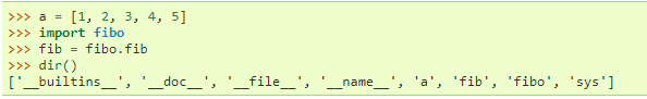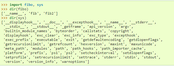 Isso não coloca os nomes das funções definidas em fibo direto na tabela de símbolos atual:isso coloca somente o nome do módulo fibo.Usando o nome do módulo você pode acessar essas funções.