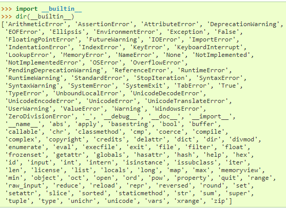 dir() não lista nomes de funções ou variáveis embutidas. Se quiser conhecê-las, seus nomes estão definidos no módulo padrão __builtin__: