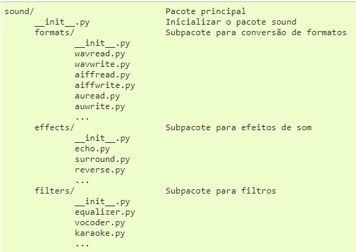 Suponha que você deseja projetar uma coleção de módulos (um "pacote") para o gerenciamento uniforme de arquivos de som.Existem vários outros formatos diferentes (normalmente identificados pela extensão do nome de arquivo, por exemplo. .wav, .aiff, .au),de maneira que você possa precisar criar e manter uma crescente coleção de módulos de conversão entre os formatos. Ainda podem existir muitas outras operações diferentes passíveis de aplicação sobre os arquivos de som (mixagem,eco,equalização,efeito stereo artificial).Após,provavelmente você também estará escrevendo uma coleção sempre crescente de módulos para aplicar estas operações. Aqui está uma possível estrutura para o seu pacote (expressa em termos de um sistema de arquivos hierárquico):