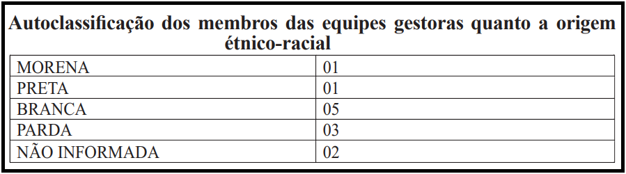 Como o número de questionários recebidos das MEG foi bem menor que o dos professores, remetemos ao quantitativo em números e não em percentuais. Como são membros da gestão escolar, todas as participantes possuem vinculo permanente com a rede municipal, são todas concursadas, possuem nível superior, sendo que quatro possuem curso de Pós-Graduação Lato Sensu. Têm entre 30 e 50 anos de idade e atuam de 11 a 20 anos na área da educação. Em relação à origem étnico-racial , cinco se autodeclararam brancas, três pardas, uma morena, uma preta e duas não informaram, como pode ser observado no quadro abaixo:
