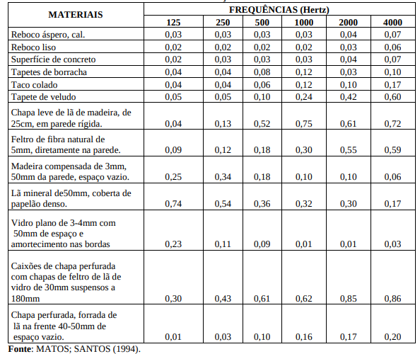 Tabela 2 - Valores médios de coeficientes de absorção acústica