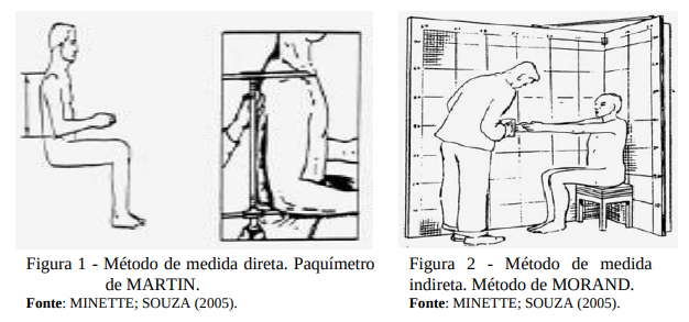 Para se obter os dados antropométricos de uma determinada amostra, antes é preciso determinar qual será o método de medida a ser aplicado. Existe o método das medidas indiretas, que, geralmente, envolvem fotos do corpo ou partes dele contra uma malha quadriculada, e o outro seria o método direto. Este último é o mais comum, e envolve leituras de instrumentos que entram em contato físico com o ser humano. Utiliza-se de réguas, trenas, fitas métricas, esquadros, paquímetros, balanças e outros instrumentos (Figuras 1 e 2).