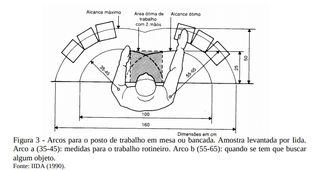 A área de alcance máximo é obtida ao girar os braços estendidos em torno do ombro, essencial para ser ocupada por objetos cuja freqüência de uso é pequena. Já as áreas de alcances ótimos podem ser definidas girando-se os antebraços em torno dos cotovelos com os braços caídos. Estas áreas são as mais apropriadas na disposição de materiais e equipamentos com uso freqüente e que exige certa precisão (Figura 3).