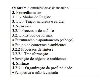 O quarto capítulo diz respeito à concepção do projeto. É feita uma apresentação dos seus objetivos, contextualizando-os com o programa da disciplina de Desenho A. Relativamente às metodologias de ensino, e para cada módulo, explicita-se as atividades e sua calendarização, os objetivos, as competências e as estratégias de ensino, os conteúdos programáticos, os recursos didáticos a utilizar e os critérios de avaliação,