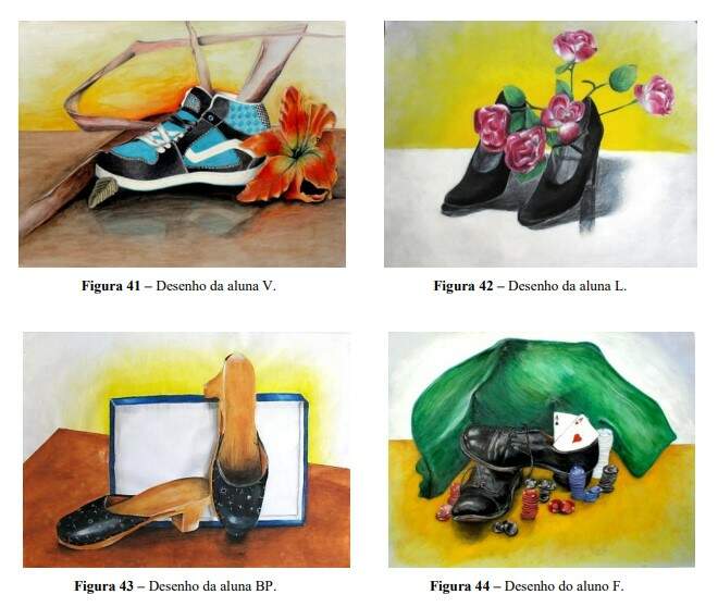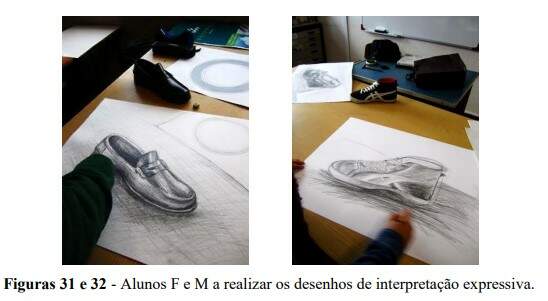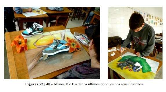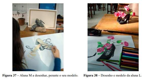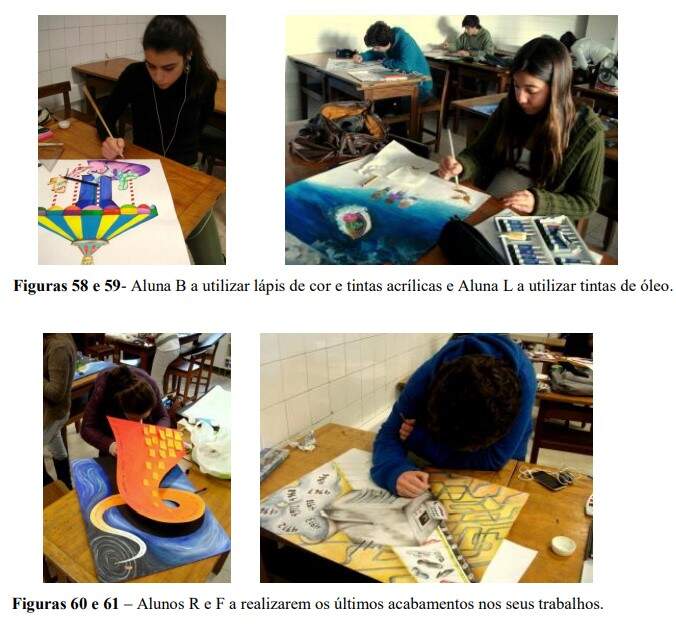 Na aula do dia 20 de janeiro os alunos iniciaram o trabalho, com a passagem do desenho de projeto realizado anteriormente para a cartolina A2 e escolheram o material e a técnica para a execução da transformação do sapato. É de salientar que esta escolha foi bastante diversificada. Por exemplo foram escolhidas as tintas acrílicas e as de óleo, os lápis de cor e os de pastel de óleo, as técnicas de colagem e de papel machê e a introdução de objetos reais no desenho (Figuras 58 a 61). Para ajudar na criação da composição, a maioria dos alunos realizou desenhos à vista a partir de imagens que trouxera de casa. Nalguns casos, por exemplo os alunos B, F e V, desenharam a partir da sua própria imaginação e conseguiram captar exatamente o que pretendiam. Este aspecto foi importante para constatar o nível de capacidades relativas ao desenho que a turma já estava a alcançar.