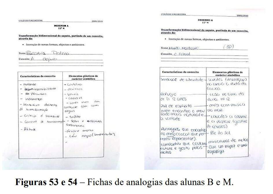 Para auxiliar o pensamento criativo, foi solicitado o preenchimento de uma ficha de apoio, ajudando os alunos a estabelecerem analogias entre o conceito escolhido e o modo de transmissão do mesmo (Apêndice O; Figuras 53 e 54). Relembrando Manuela Romo, “a habilidade de encontrar relações insuspeitas entre as coisas é a mais importante para a realização criativa”, e essa habilidade estabelece-se através da analogia e da metáfora (2008: 88).