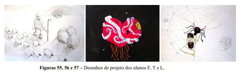 Os resultados dos trabalhos foram positivos (Figuras 63 e 64; Ficheiro de figuras L). Foi visível a variedade de conteúdos simbólicos transmitidos e a diversidade de materiais e técnicas escolhidas e experimentadas pelos alunos. Através desta escolha os alunos puderam desenvolver o seu próprio modo de expressão, tal como expressar as suas vivências e os seus interesses através do desenho, tornando-se bastante motivador e enriquecedor para os próprios.
