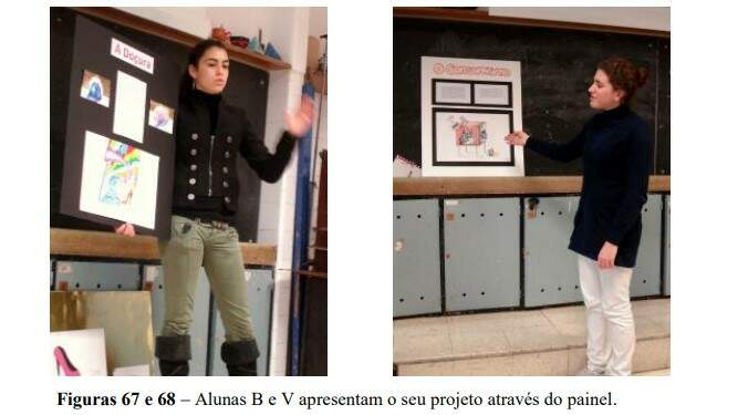 Na aula do dia 25 de fevereiro, procedeu-se às apresentações orais dos projetos (Figuras 67 e 68). Os alunos tiveram que explicar todo o processo implementado, tendo como auxiliar o painel de anteprojeto: desde a escolha do tema e sua justificação, até ao local escolhido, aos materiais e aos recursos utilizados.