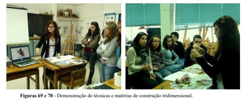 No dia 1 de março foi realizada uma demonstração que deu a conhecer diversas técnicas e materiais para aplicação dos processos de construção tridimensional (Figuras 69 e 70; Ficheiro de figuras U). A pedido da professora cooperante Sofia Casanova, os seus alunos do 12º ano da disciplina de Materiais e Tecnologias também estiveram presentes nesta aula. Foram apresentados os desenhos de projeto do professor, visualizadas imagens das peças e explicado o seu modo de construção. Para além disso apresentou-se um conjunto de imagens de obras de artistas contemporâneos, que utilizam materiais inovadores nos seus trabalhos. Por exemplo, as esculturas em cartão de Chris Gilmour, as obras com rede de capoeira de Ivan Lovatt, as esculturas de lápis de Jennifer Maestre, os trabalhos em papel de Jacqueline Rush Lee e Jen Stark, entre outros (Ficheiro de figuras E). O objetivo foi o de dar a conhecer aos alunos as diversas hipóteses de utilização de novos materiais.