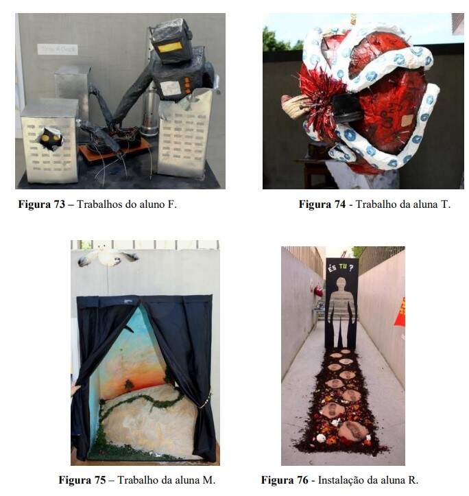 A maioria dos alunos adaptou a ideia de instalação a uma espécie de maquete (Figuras 73 e 75). Três alunos abordaram a escultura (Figura 74) e uma aluna optou pela realização de uma instalação, já que o seu projeto era possível de executar no local escolhido e no tempo estipulado para este módulo (Figura 76).
