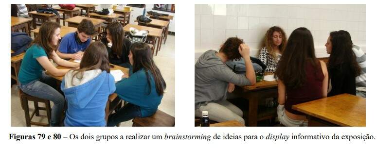 No dia 14 de abril cada grupo de trabalho fez um Brainstorming de ideias, de modo a procurar uma solução criativa para o display publicitário (Figuras 79 e 80). Segundo Parnes (Ap. Lowenfeld & Brittain, 1947) esta técnica visa libertar o pensamento individual através do apoio do grupo, pois cada elemento é convidado a expressar espontaneamente um grande número de ideias. Todos os pensamentos divergentes foram debatidos e de seguida foi avaliado o melhor método que resolvesse o problema proposto. Após a decisão por parte do grupo, as ideias foram apresentadas aos colegas do grupo oposto. Foram comentadas e discutidas as suas possibilidades de melhoria. Após chegarem a uma conclusão final, cada grupo iniciou os esboços dessas mesmas ideias.