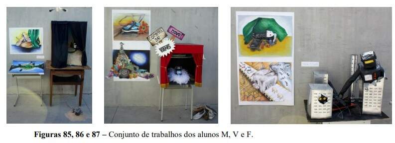 Tal fato restringiu o espaço disponível para todos os trabalhos e limitou o modo de exposição, ficando os mesmos com pouco apertados. Os trabalhos de cada aluno foram expostos em conjunto, obedecendo à sequência da passagem do real para o imaginário: primeiro o desenho de observação, passando pelo desenho de transformação bidimensional, até ao modelo tridimensional do projeto (Figuras 85, 86 e 87). Pensou-se em expor o painel de anteprojeto perto deste último, de modo a explicar a ideia pretendida e o processo criativo. Tal não foi possível, devido ao pouco espaço expositivo concedido à turma. Decidiu-se assim colocar uma legenda com a indicação do conceito escolhido por cada aluno.