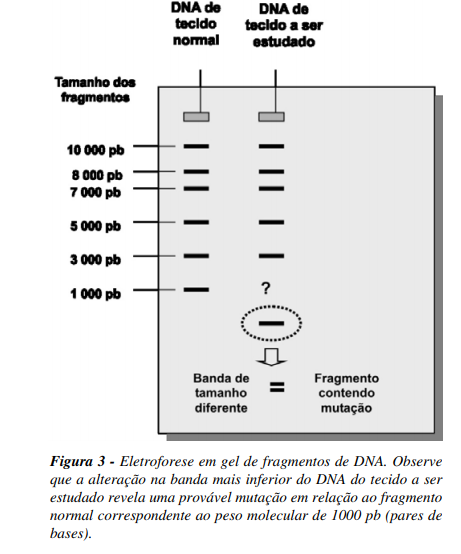 Caso o laboratório disponha de aparelhos de PCR mais modernos (real-time PCR) esta identificação e mensuração dos segmentos a serem examinados poderá ser realizada eletronicamente, no chamado tempo real. Caso o aparelho de PCR não disponha deste recurso, o produto de sua amplificação deverá ser identificado posteriormente em gel de eletroforese (Figura 2). Como qualquer alteração na sequência de DNA implicará uma alteração de seu peso molecular, será possível observar se a sequência do segmento gênico examinado está íntegra ou não, pois o peso molecular do segmento normal é conhecido (Figura 3).