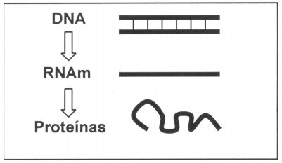 Estima-se hoje que cada célula necessite para seu funcionamento vital de cerca de 10 000 proteínas diferentes, cada uma delas desempenhando uma tarefa específica. Estas proteínas, como sabemos, são produzidas a partir de segmentos de sequências gênicas no DNA, através da qual se estruturam moléculas de RNA, descritas como mensageiras (RNAm). Estas moléculas irão migrar a partir do DNA nuclear para os ribossomos, no citoplasma, onde, através de ligações com outra forma de RNA (descrito como transportador), irão realizar a síntese das proteínas mediante o encadeamento sequencial de aminoácidos. Poderíamos então sumarizar esta seqüência de eventos da seguinte forma:
