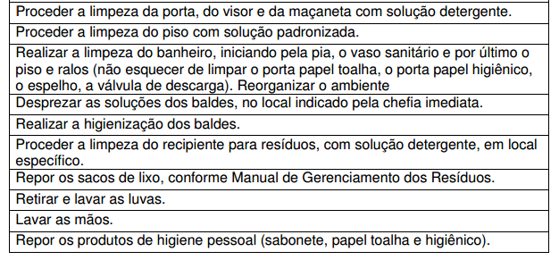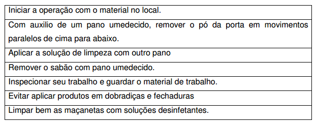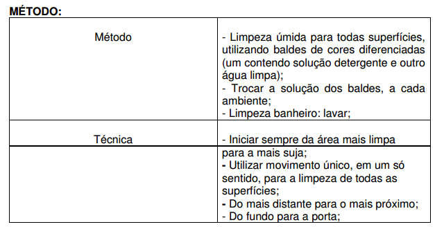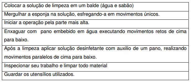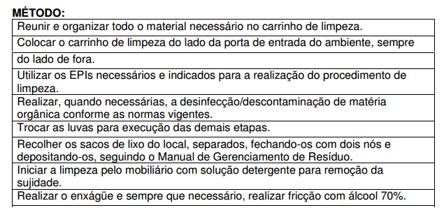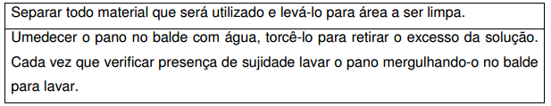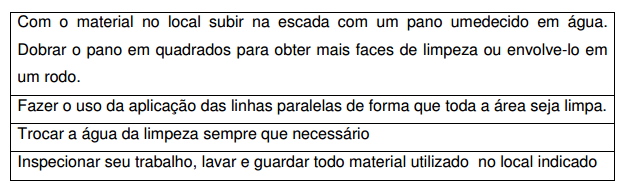 • Material (balde, esfregão, mops, água, equipamentos de proteção individual, sinalização de segurança).
