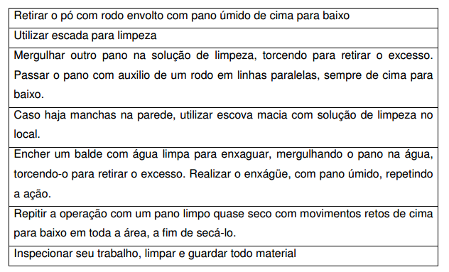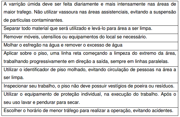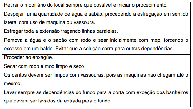 • Material (pano de chão lavado e limpo, balde, rodos, maquinas elétricas ou vassoura de piaçava, água, solução detergente e desinfetante, equipamentos de proteção individual, sinalização de segurança)