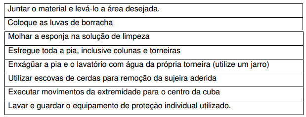 • Material (solução desinfetante e solução detergente, esponja abrasiva, luvas de borracha, jarro, pano macio).