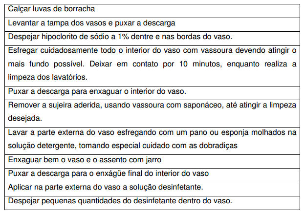 • Material (baldes, solução detergente e desinfetante, esponja e/ou escova, luvas de borracha, pano e vassoura, equipamento de proteção individual).