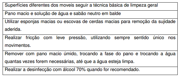 • Não utilizar material de limpeza de pisos e banheiros, na limpeza de móveis e de outras superfícies.