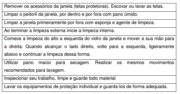 • Material (escada, rodo, pano limpo, água, luvas, óculos de segurança)
