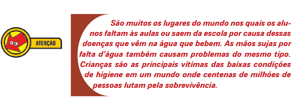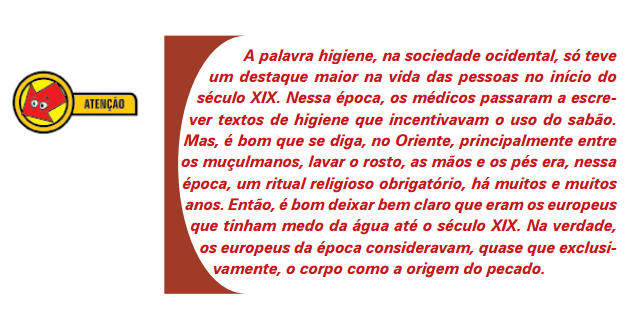 • Tomar banho diariamente: já falamos sobre o hábito do banho, em um capítulo anterior. Vimos que os nobres europeus preferiam encharcar-se de perfume a tomar banho e que, naquela época, as pessoas acreditavam que a água amolecia nosso corpo, provocando doenças e atrapalhando o crescimento das crianças e dos jovens. Para muitos, era um único banho por ano! No Brasil, dizem os historiadores, o rei dom João VI, pai de dom Pedro I, só concordou em tomar banho depois que teve uma ferida inflamada na perna, e o médico real o convenceu a se banhar ou não ficaria curado.