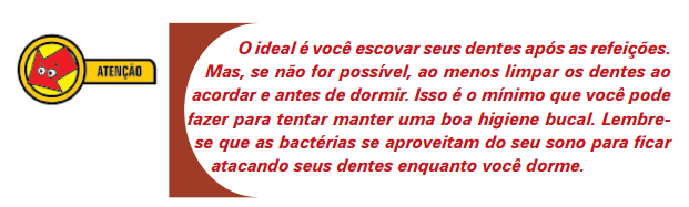 Os dentes devem ser escovados no mínimo duas vezes por dia, de preferência sempre depois das refeições e antes de dormir. O uso da escova de dente é o meio mais eficaz e mais simples para a higiene bucal. A escova deve ser lavada em água corrente, cada vez que for usada, e guardada em local limpo. Em geral, ela deve ser trocada a cada dois ou três meses de uso, pois quando as cerdas estão amassadas e tortas não alcançam seu objetivo, que é limpar a superfície dos dentes e as gengivas
